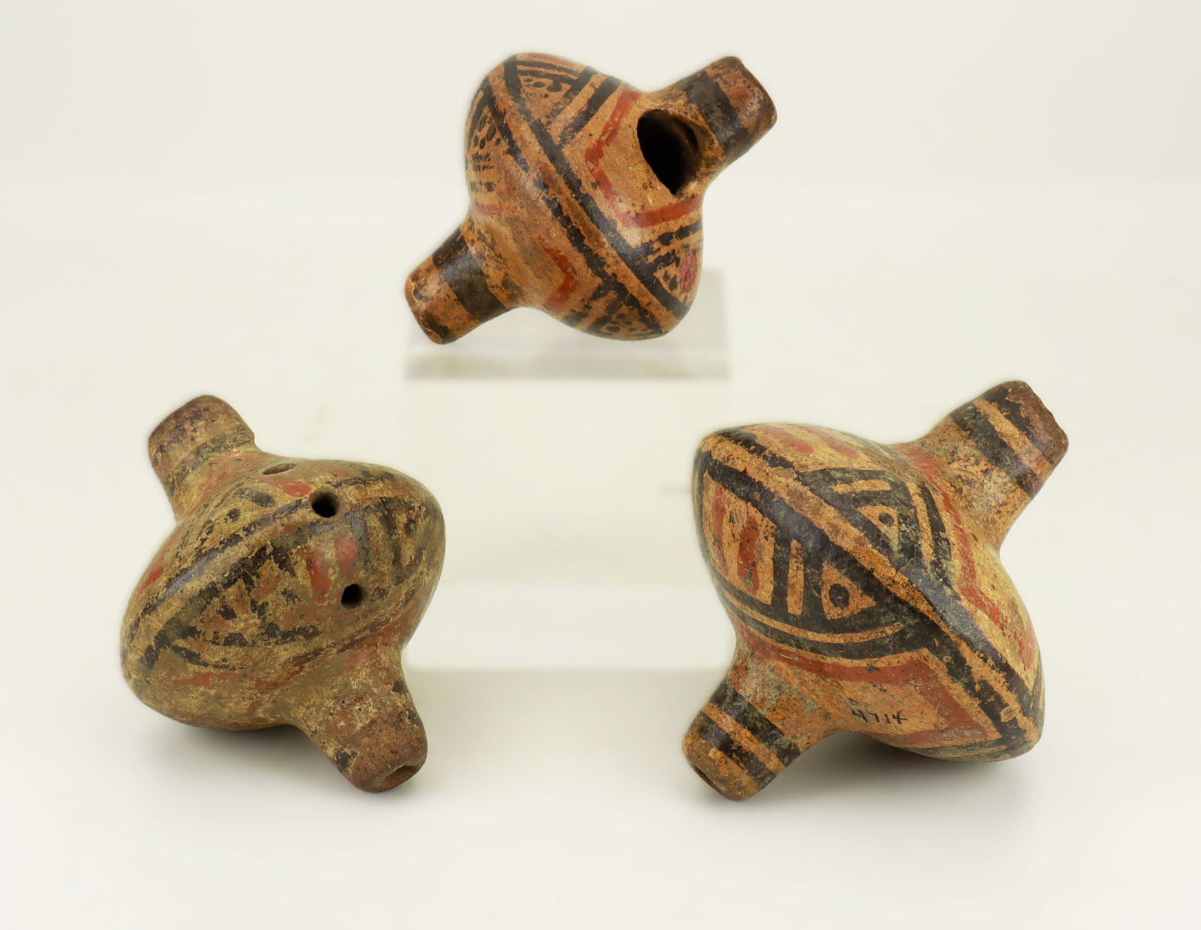 Otro conjunto de ocarinas son las elipsoidales o con forma de trompo, en las cuales, si bien tienen una variedad de tamaños, el diseño y la decoración pictórica parece responder a un patrón. En estas ocarinas la boquilla presenta forma cilíndrica, en la base tiene el labio, el cuerpo es elipsoide con tres orificios alineados y otro extremo ligeramente más corto que la boquilla.