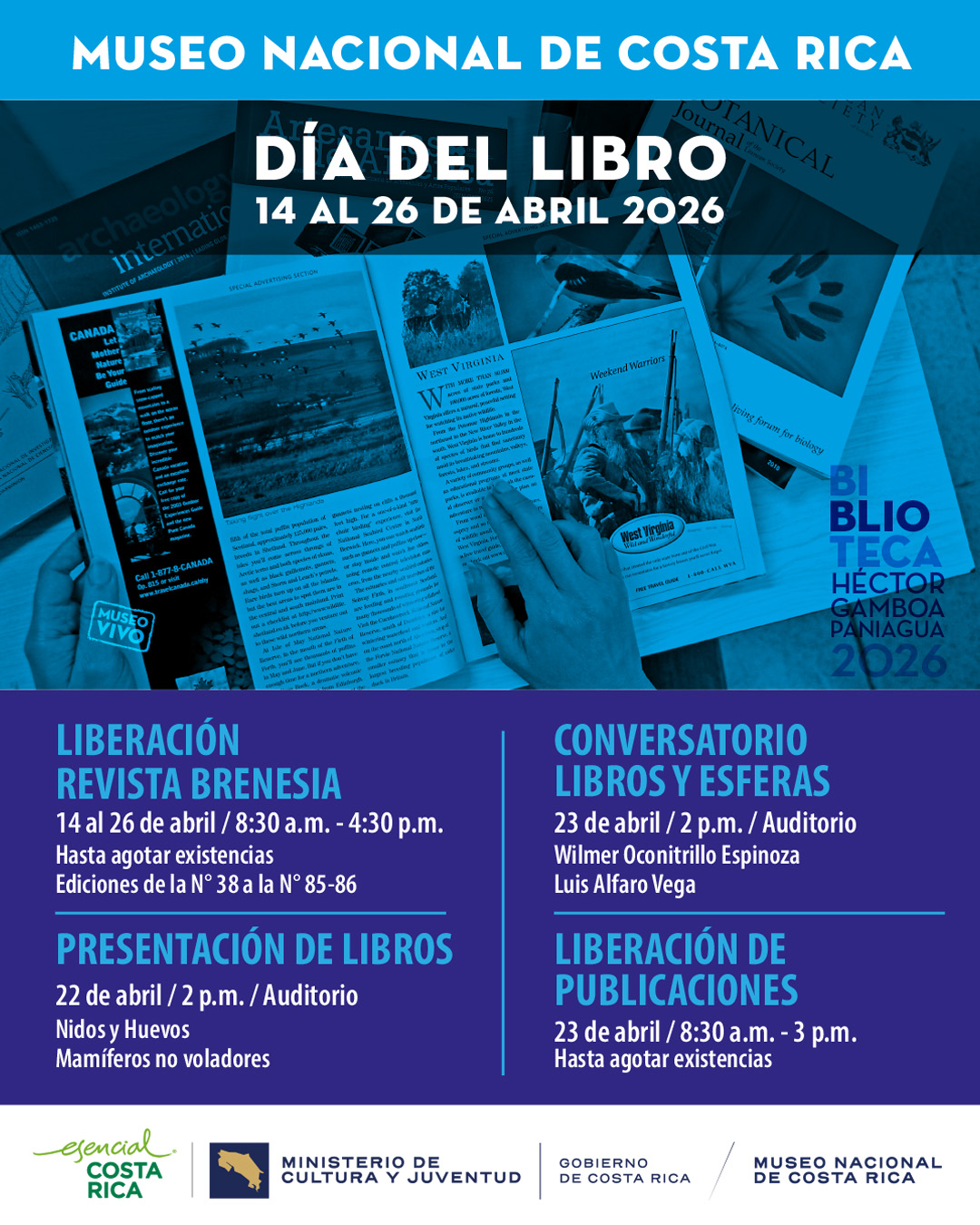 Del 14 al 26 de abril de 2026, el Museo Nacional de Costa Rica, se suma a las actividades en torno al Día del Libro, conmemorado el 23 de abril de cada año. Es esta oportunidad, la biblioteca del Museo, Héctor Gamboa Paniagua, le propone descubrir las publicaciones realizadas por la institución a lo largo de los años, en las áreas de arqueología, antropología, historia natural e historia de Costa Rica, y le invita a compartir con autores nacionales que se han inspirado en el patrimonio cultural costarricense para producir sus obras.