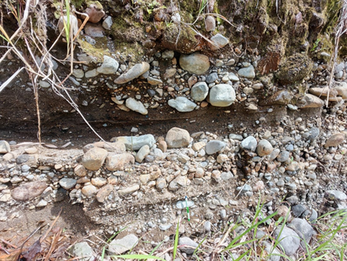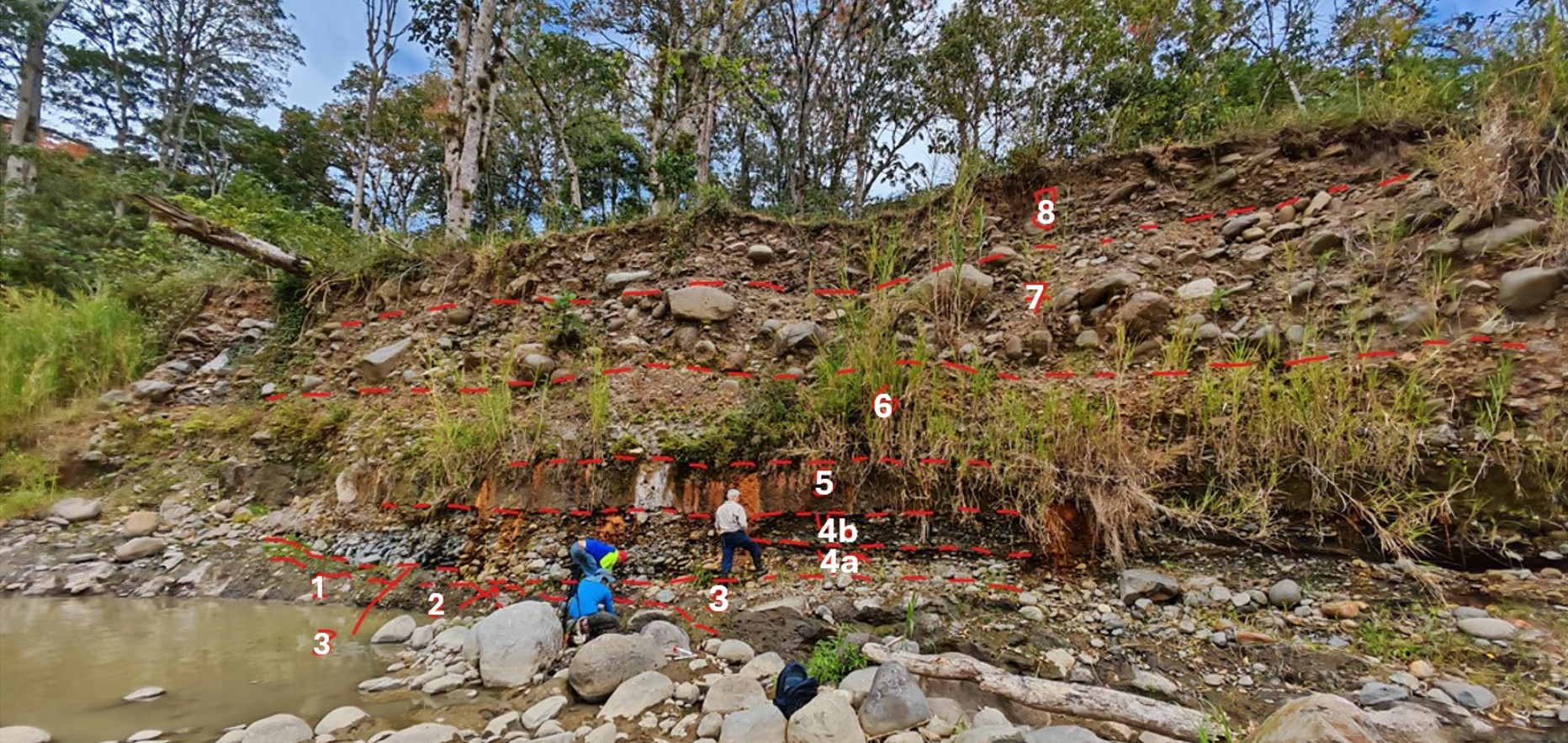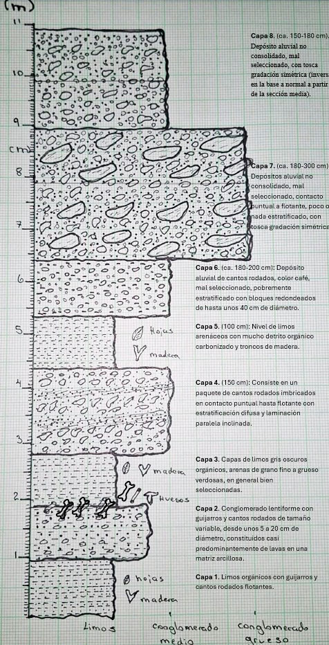 El contraste entre las capas 1 a 3 (más finas) y las capas 4 y 6 a 8 (más gruesas) sugiere un cambio en el nivel de base y en la dinámica del sistema fluvial. La mayor proporción de clastos intrusivos en las capas superiores podría reflejar variaciones en las áreas fuente o en el grado de incisión del sistema. La capa 2 podría corresponder a un lahar originado en las partes altas del volcán Irazú, lo que explicaría su elevado contenido volcánico, la presencia de madera carbonizada y la escaza cantidad de cantos rodados de rocas intrusivas.