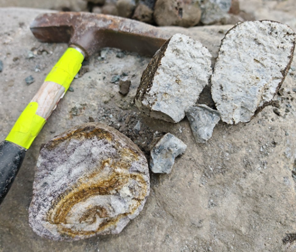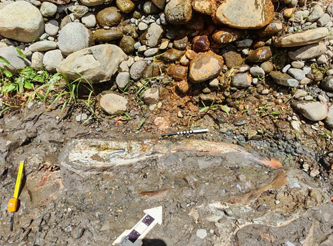Los ejemplares fósiles recuperados se localizan en la base de una berma erosiva de aproximadamente 4 m de ancho, dentro de una secuencia de depósitos de río (aluviales) y pantanosos (palustres) expuestos en el talud de una terraza aluvial que limita el cauce activo del río.