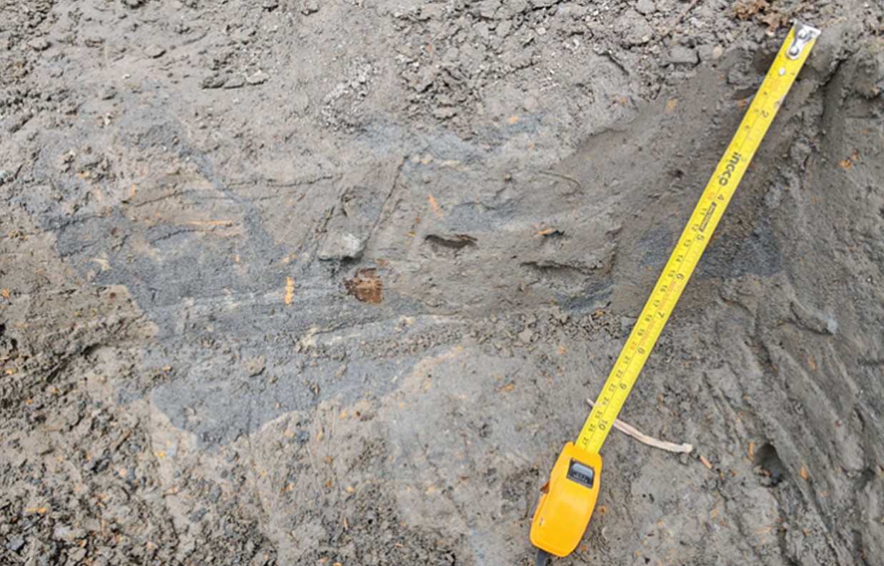 Restos fósiles contenidos en una cama aluvial de la capa 2 (tonalidades grises oscuro y verdosas), con transición lateral hacia una capa orgánica areno-limosa (capa 3).